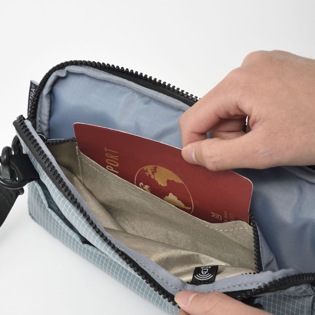 配備防盜刷面料的拉鍊口袋,可阻擋RFID信號,保護您的信用卡等個人資訊安全。