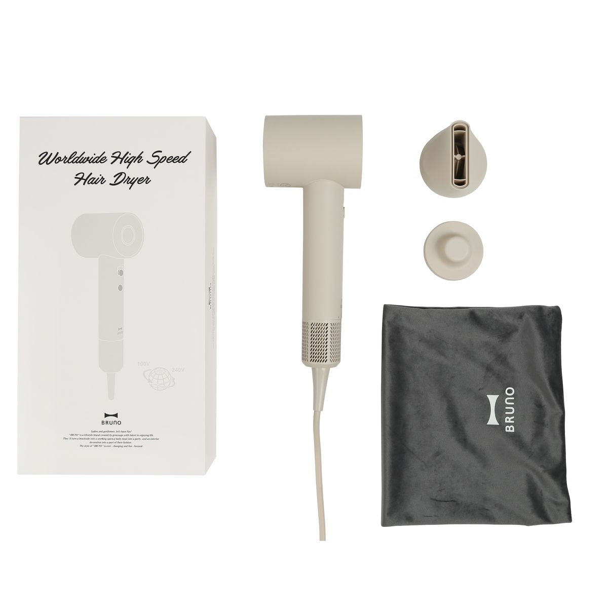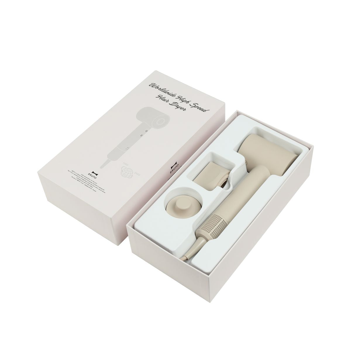 BRUNO 全球電壓高速風筒,採用11萬轉高速無刷直流摩打及智慧溫度控制系統,確保強勁風力快速吹乾秀髮的同時,也能呵護髮絲,加上全球通用電壓設計,讓您的美髮體驗不受地域限制。