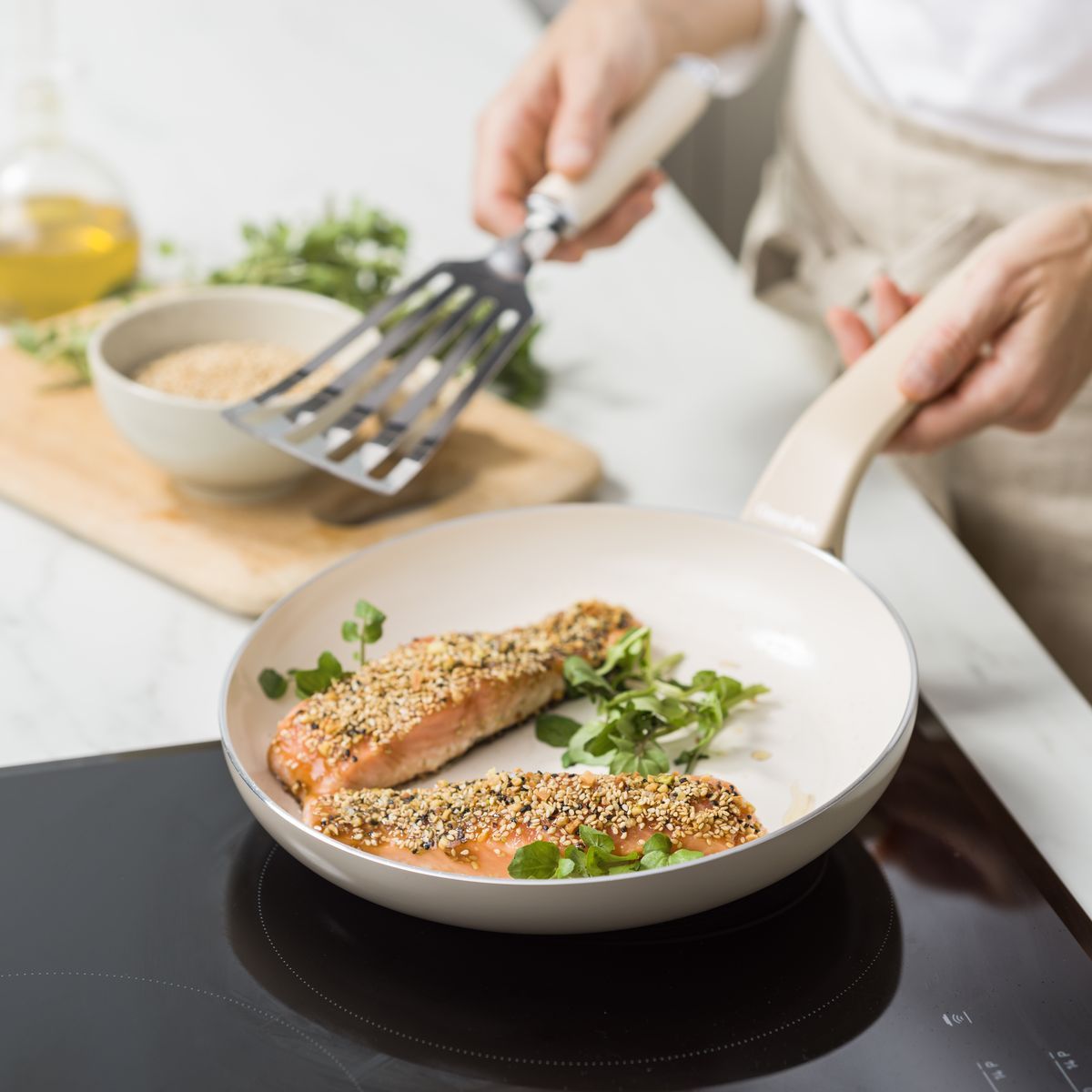 Essence 系列以簡約時尚的設計,融合對環境的關懷,打造出兼具美感與實用性的日常烹飪廚具,展現精緻品味。鍋具採用最新一代無PFAS的Thermolon™ 第九代陶瓷易潔塗層,並以鑽石強化,大幅提升耐用度與易潔效果,讓烹飪和清潔都輕鬆無負擔。