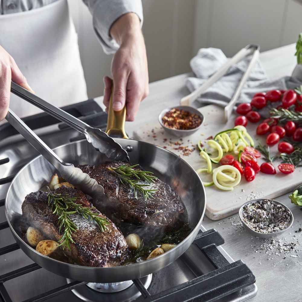 Padova 不鏽鋼系列將前衛設計與卓越性能完美融合。這款 28 厘米煎鍋採用專業級三層不鏽鋼打造,適合處理大份量食材,無論是日常煎炒還是專業的爐灶至烤箱烹飪都能輕鬆應對。