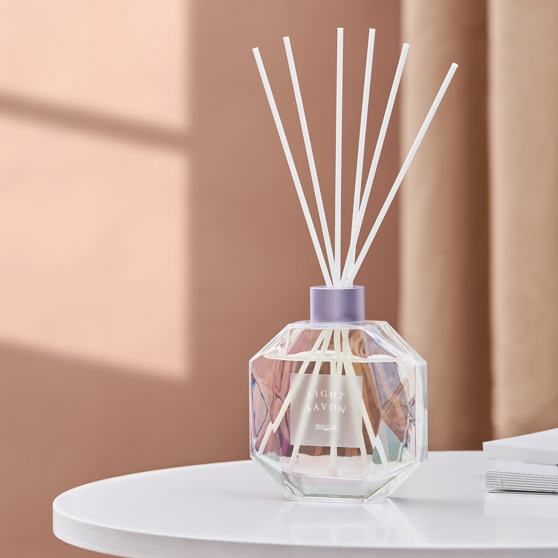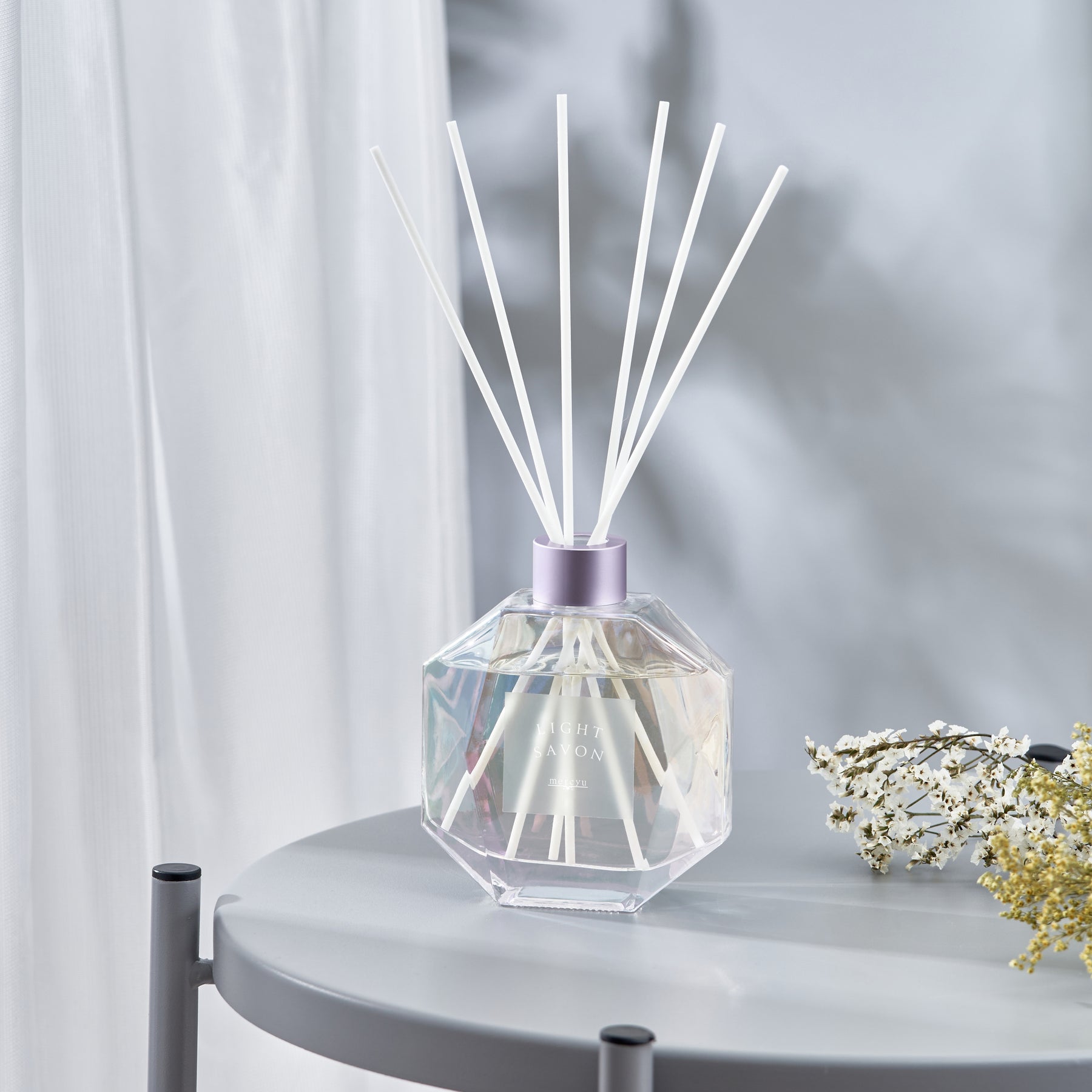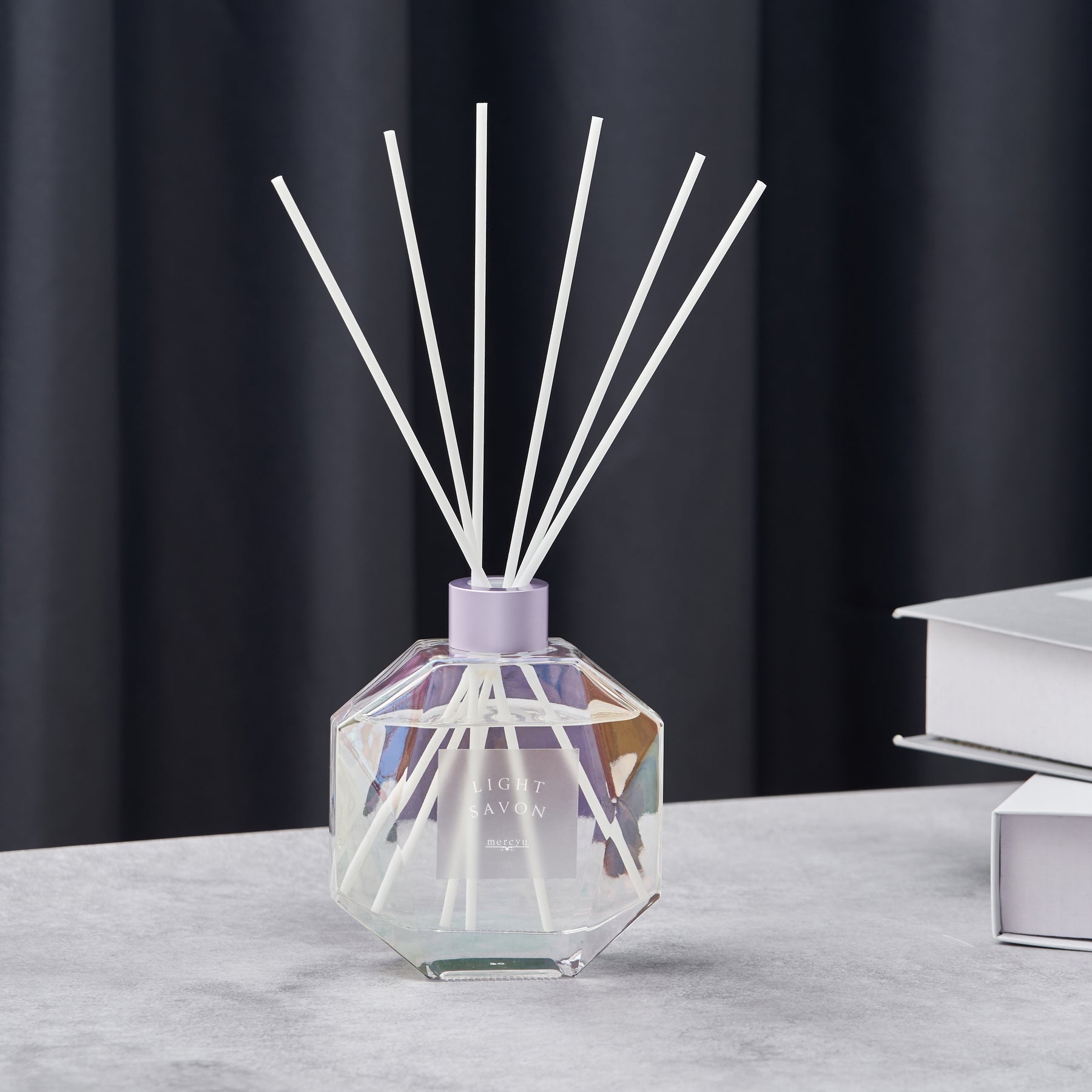 這款藤枝擴散器採用美麗的極光玻璃瓶,能變換出彩虹般的色彩。八角切割玻璃反射光線,使房間色彩繽紛。纖薄的瓶身可放置在有限的空間內。我們精選了2種受歡迎的香氣,以配合其華麗而清新的美感。瓶身設計和香氣營造出奢華的氛圍。包裝也飾有極光燙金,呈現優雅的質感,非常適合送禮。