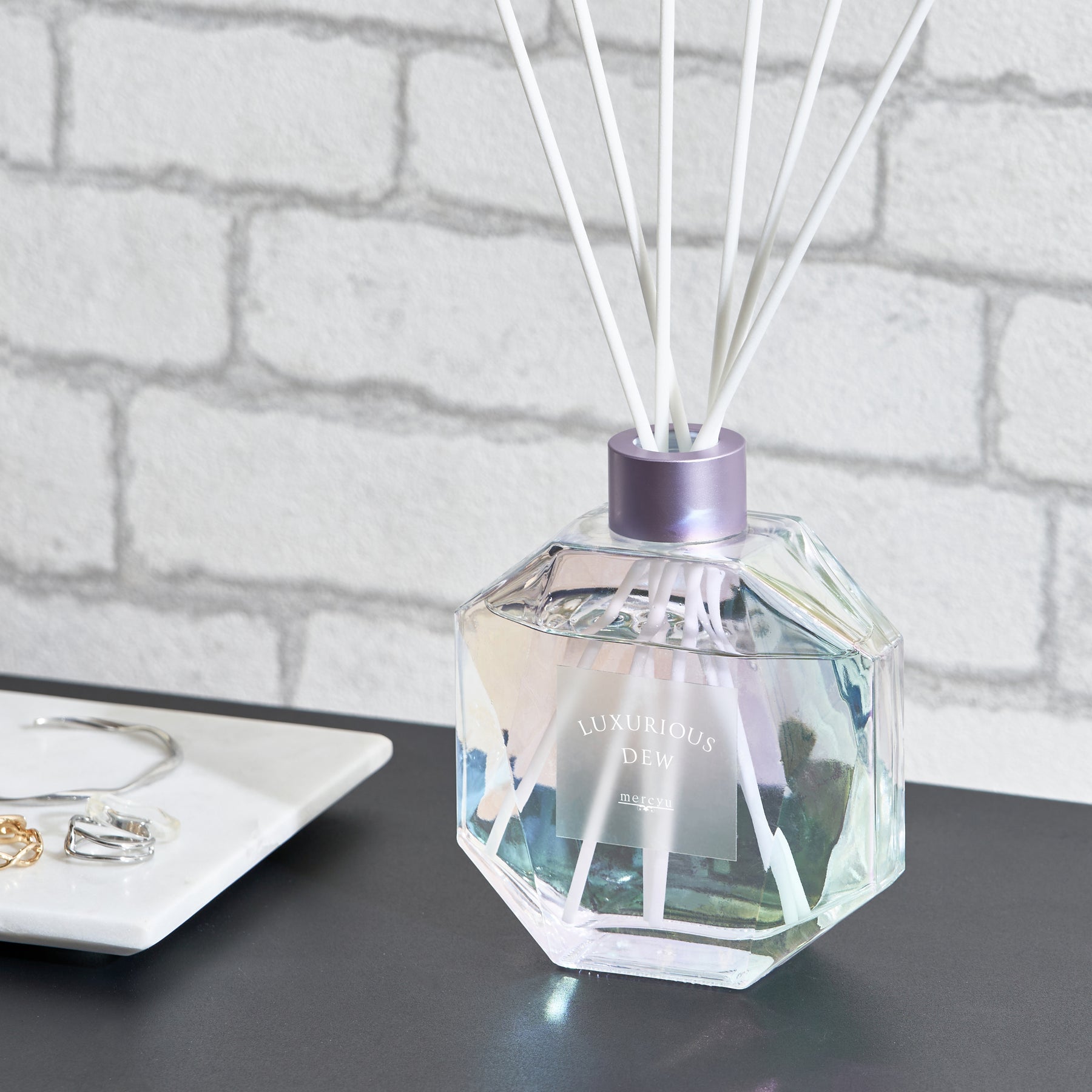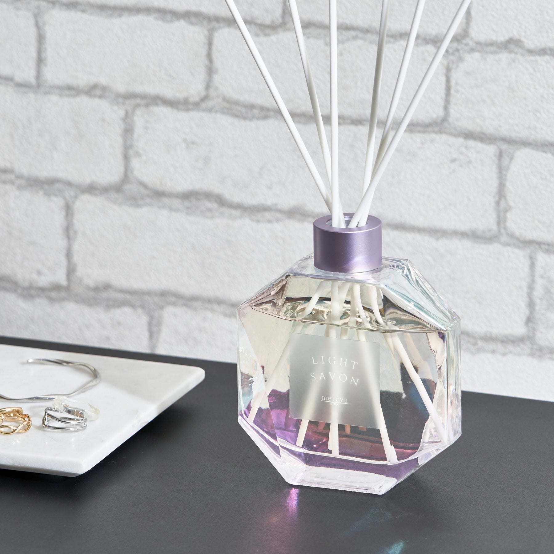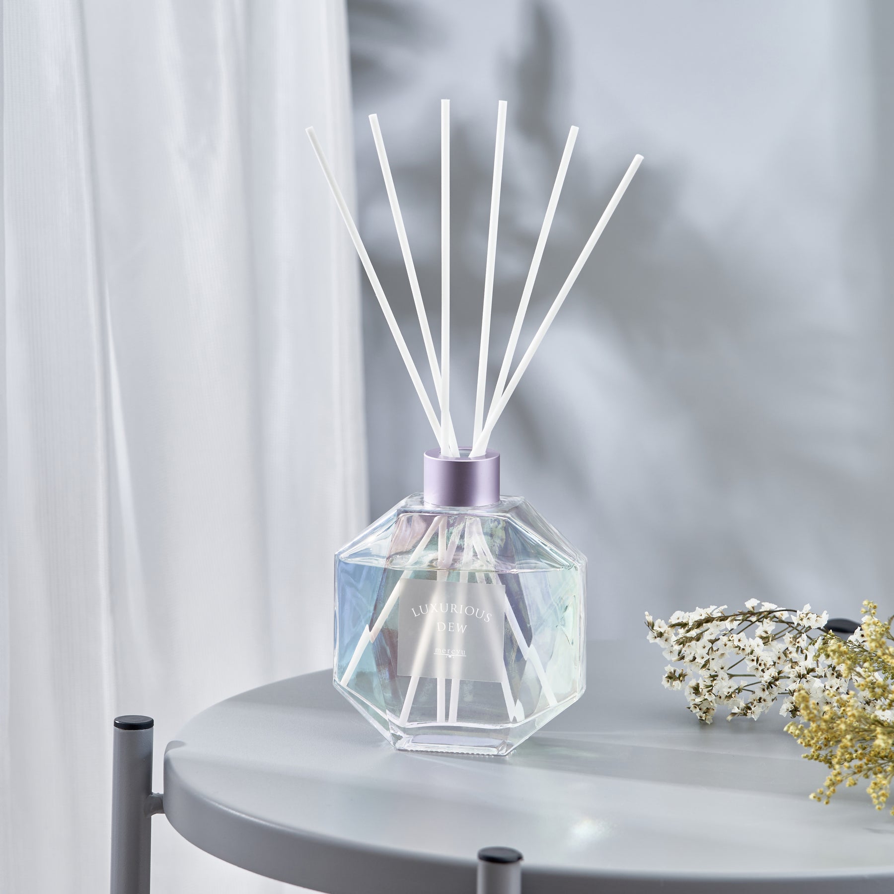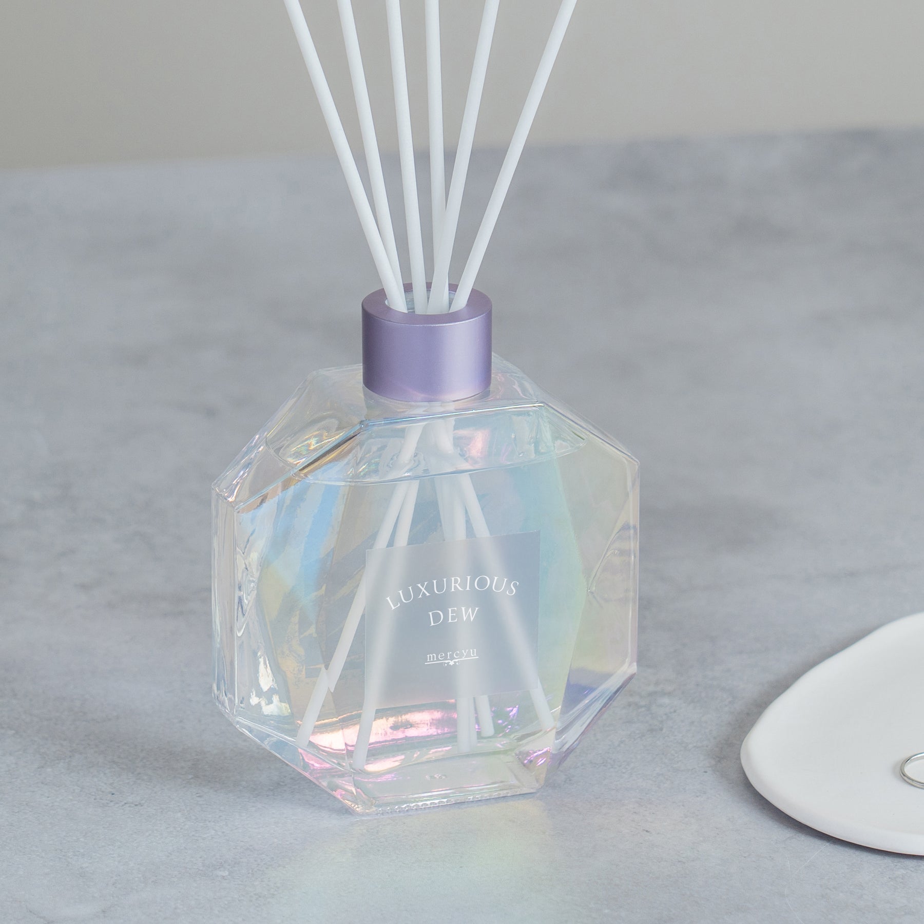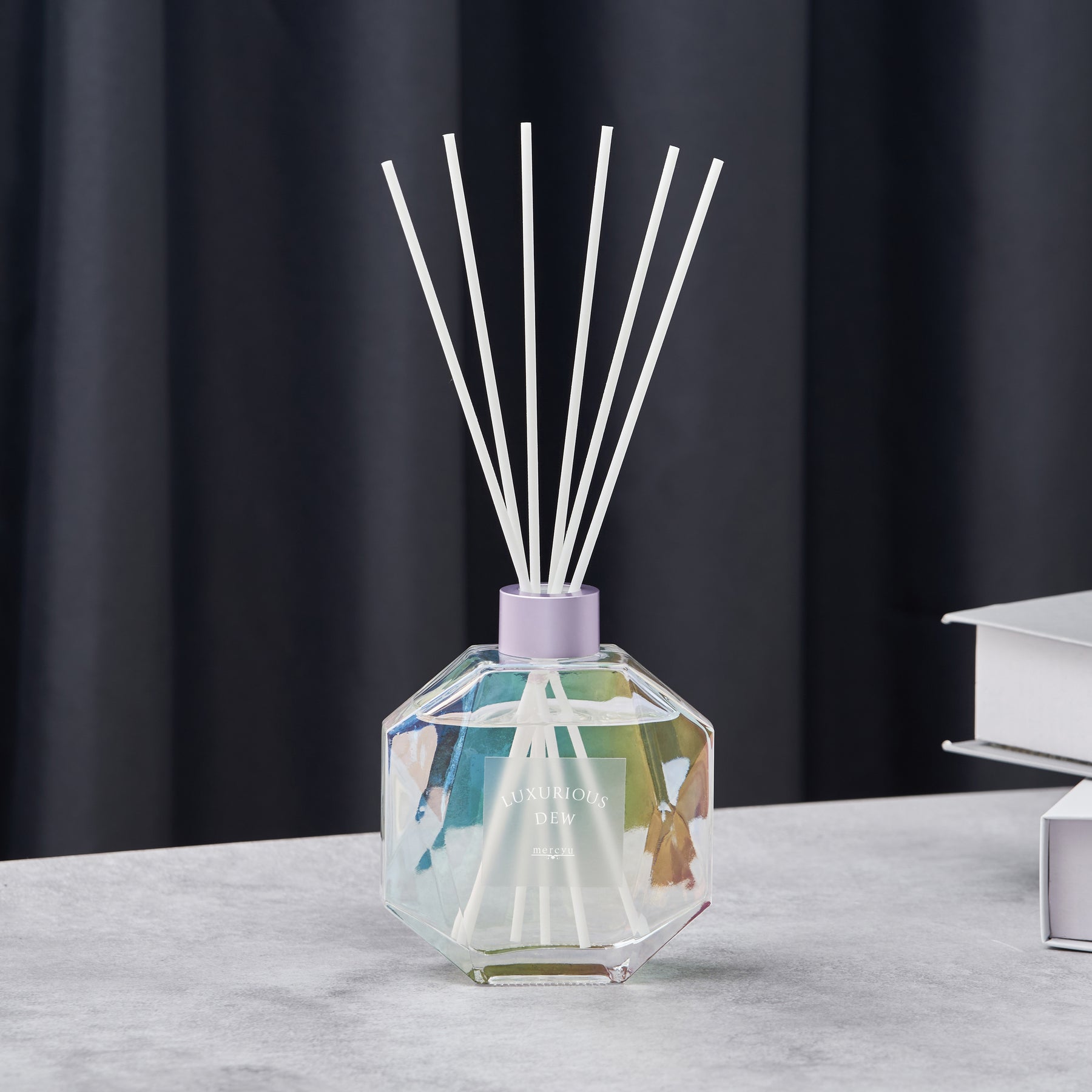 這款美麗的擴散器玻璃瓶身帶有塗層,散發出極光般的絢麗光澤。切割玻璃瓶捕捉並反射光線,為房間增添色彩。