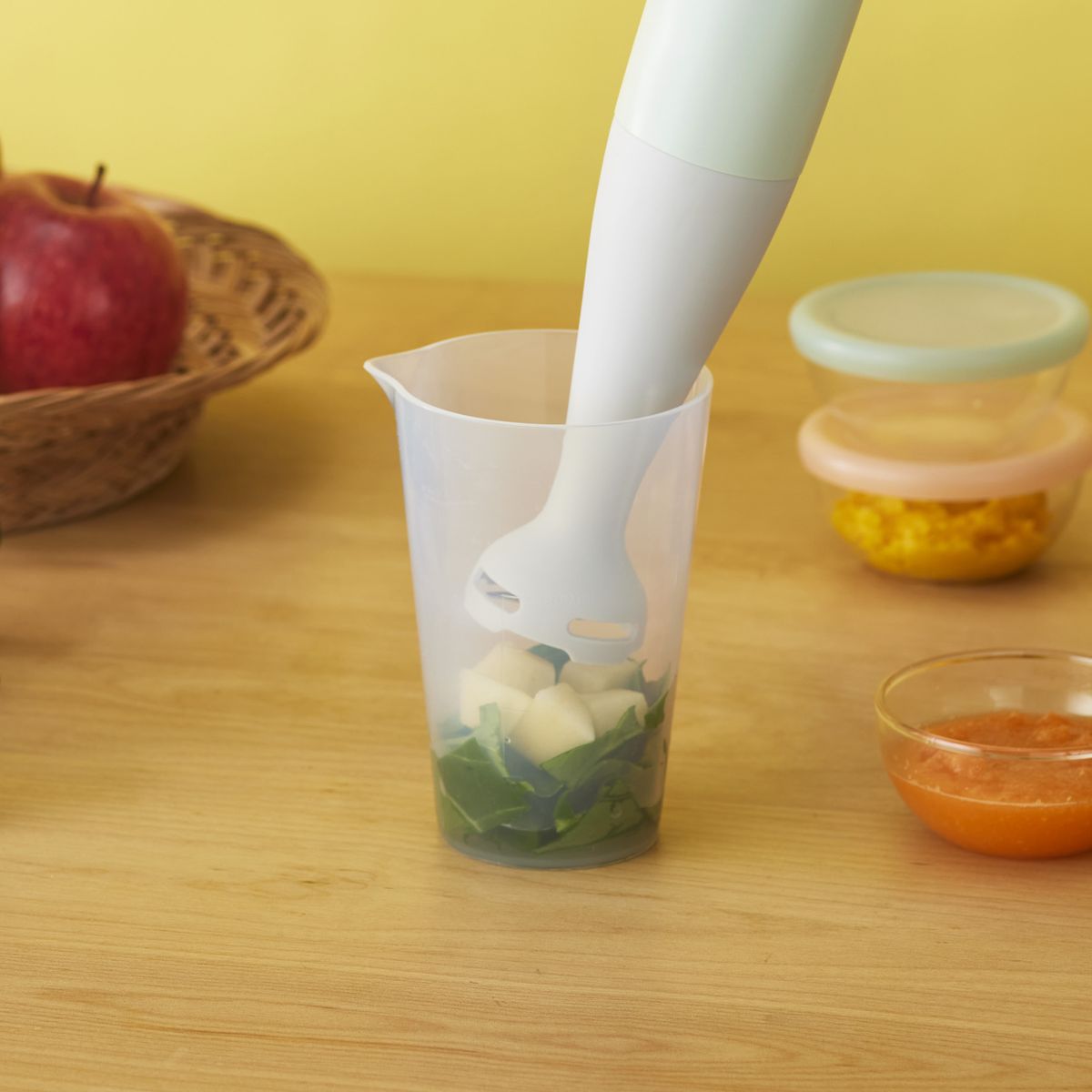 配備小型刀頭和專用杯,能輕鬆處理少量食材,攪拌均勻,是製作初期離乳食品的理想選擇。