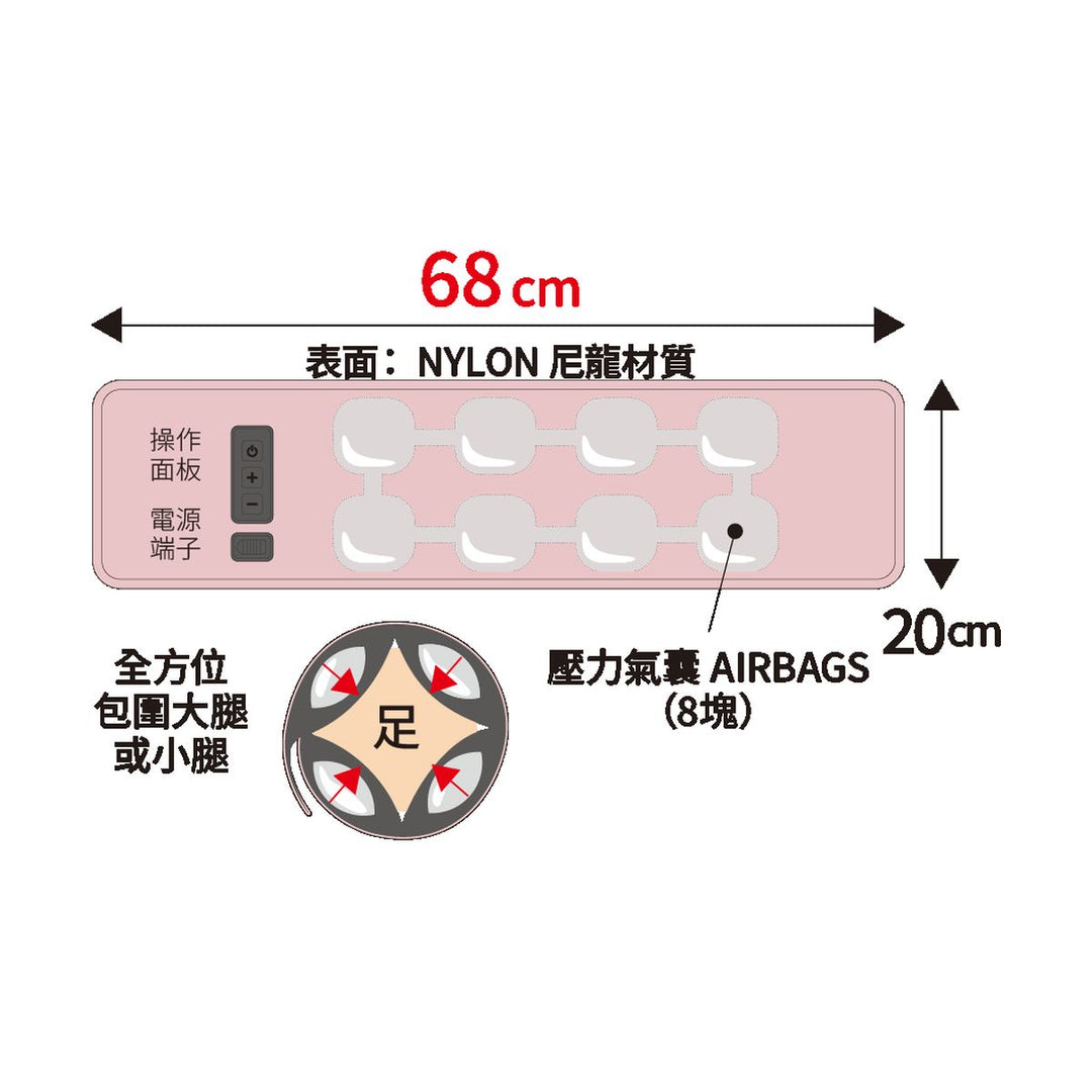 專為完整包覆大腿設計的超大尺寸,魔術貼設計可自由調節鬆緊。一旦纏繞在腿上,8個氣囊會充氣,從各個方向包覆您的腿部。