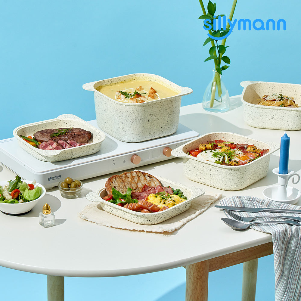 Sillymann Easyway Metal 6件組萬能鍋,專為小空間及多樣化烹飪需求而設計。這套六件組結合了深湯鍋、深平底鍋與燒烤盤,搭配矽膠配件,讓您從日常烹飪、火鍋到精緻燒烤都能一應俱全,烹飪後更可直接端上桌享用。